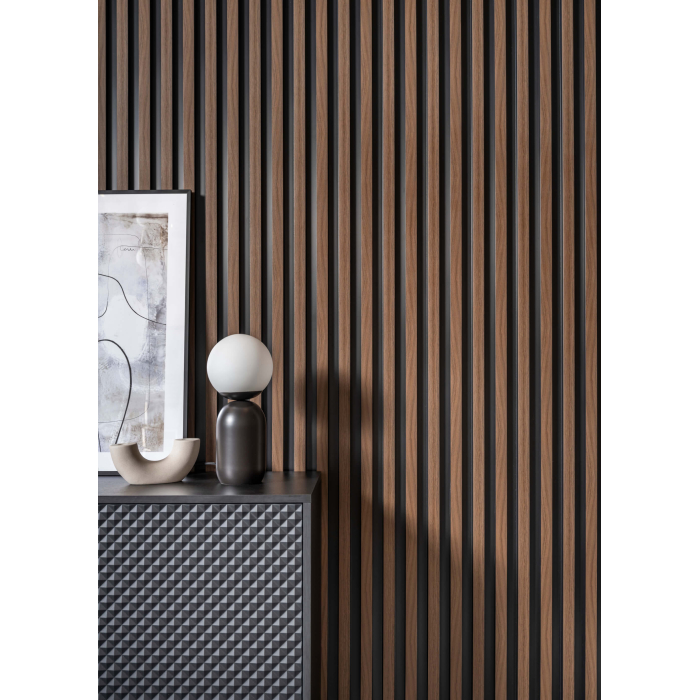 Overflaten på panelet er forsterket med patentert ScratchShield®-teknologi for å motstå riper og utilsiktede merker, noe som garanterer lang holdbarhet i hvert rom. Det detaljerte mønsteret gir en elegant touch og skaper et tydelig fokuspunkt som gir en interessant tredimensjonal effekt i rommet.